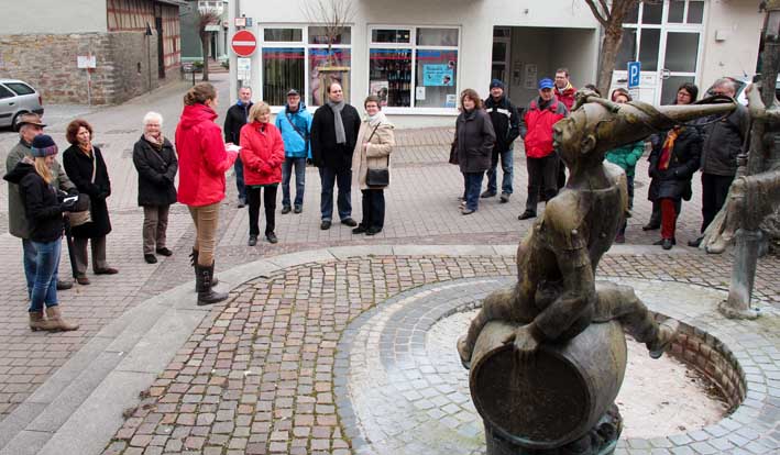 Zur Begrüßung erhielten die rund 20 Teilnehmer einen Secco und wurden auf die knapp dreistündige Führung eingestimmt. Die Stadtführerinnen Julia Neckermann und Katharina Sack entführten die Teilnehmer zu allen historischen und sehenswerten Highlights in der Altstadt von Lauda und wussten ebenfalls von interessanten Geschichten zu berichten. Ein Besuch beim Weingut Sack mit dem größten beschnitzten Holzfass im Taubertal durfte hier nicht fehlen. Bei dieser Besichtigung wurde der erste Wein, eine 2012er Scheurebe von der Oberlaudaer Steinklinge, verkostet. Im Anschluss standen noch das Dampflokdenkmal und die Kirchen in der Altstadt auf dem Programm, bevor die Führung in der „Strumpfkapp“ endete. In der Kultkneipe wurde den Besuchern von der Weingästeführerin Elke Nixdorf-Maertens die städtische Weinkultur nähergebracht. Mit einem Grauburgunder und einem Acolon aus Beckstein gab es abschließend noch einige tiefe Einblicke in die Weinverkostung.