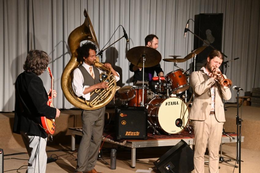 Die Musiker Marko Mebus (Trompete), Markus Fleischer (Gitarre), Matthew Bookert (Sousaphon) und Maximilian Hering (Schlagzeug) harmonierten dabei auf höchstem Niveau. Ihre Versionen von „What a Wonderful World“, „Alexander‘s Ragtime Band“, „Love walked in“ oder „When the Saints Go Marching In“ überzeugten durch musikalische Feinfühligkeit, dynamisches Zusammenspiel und solistische Brillanz. Besonders das Sousaphon von Matthew Bookert setzte klanglich ungewöhnliche, aber überaus reizvolle Akzente, die dem klassischen Jazzsound eine erdige Tiefe verliehen.