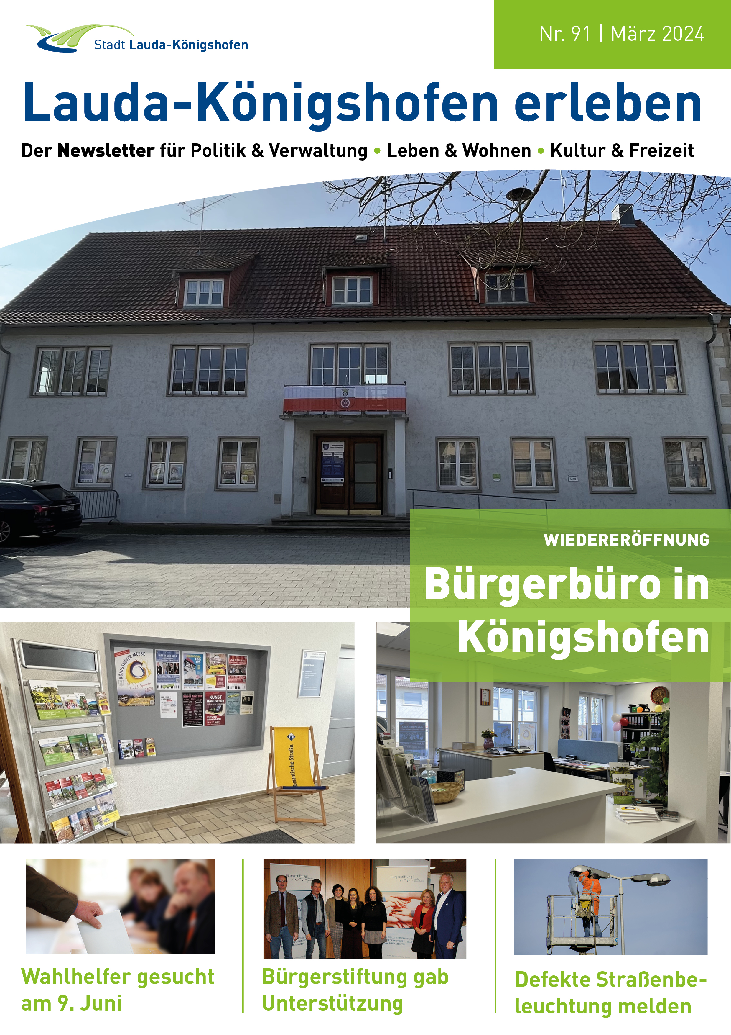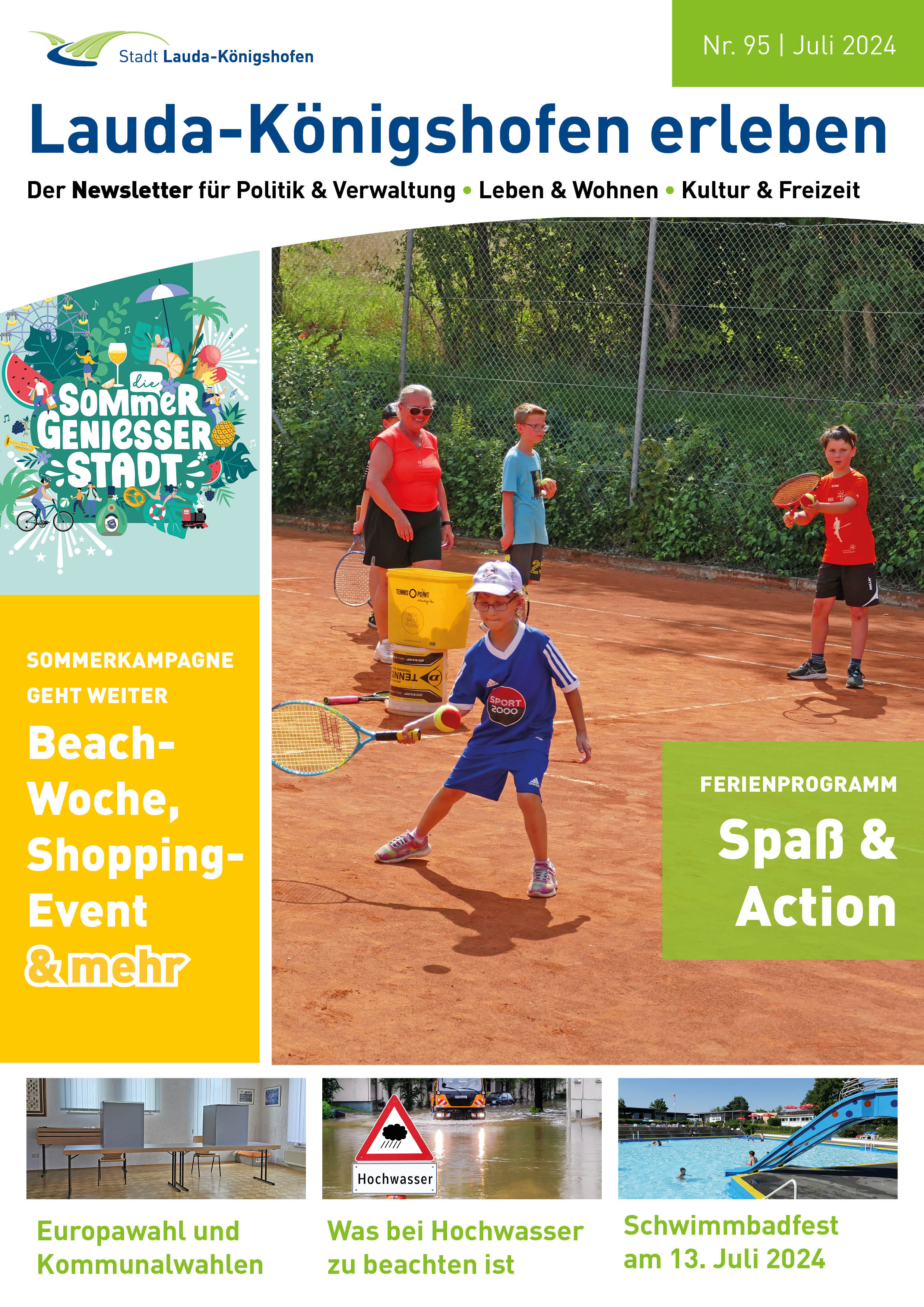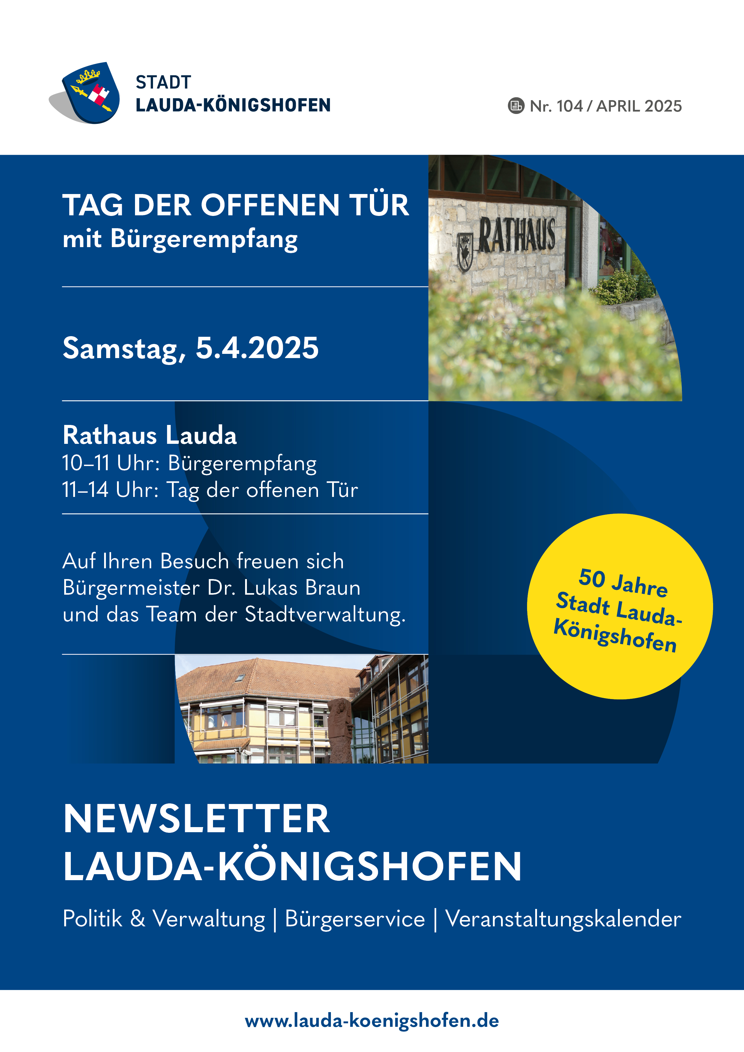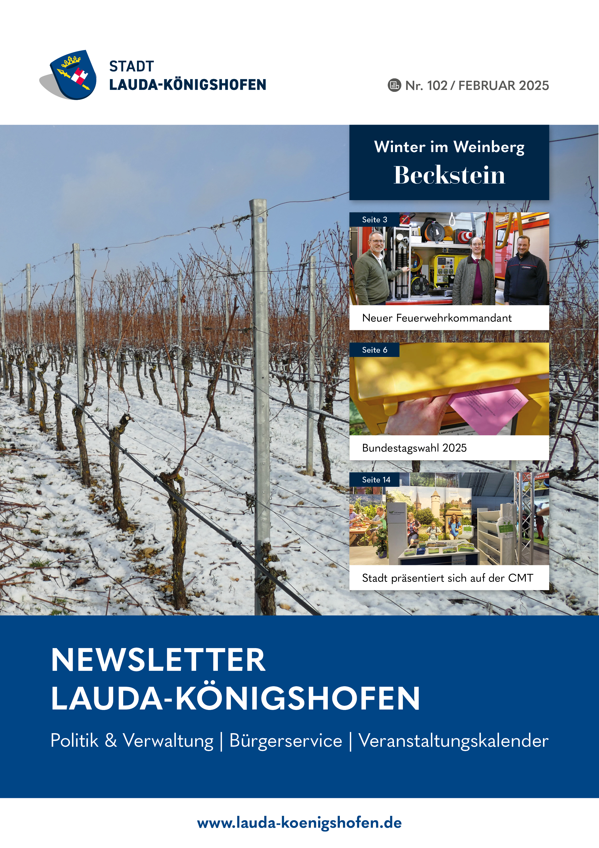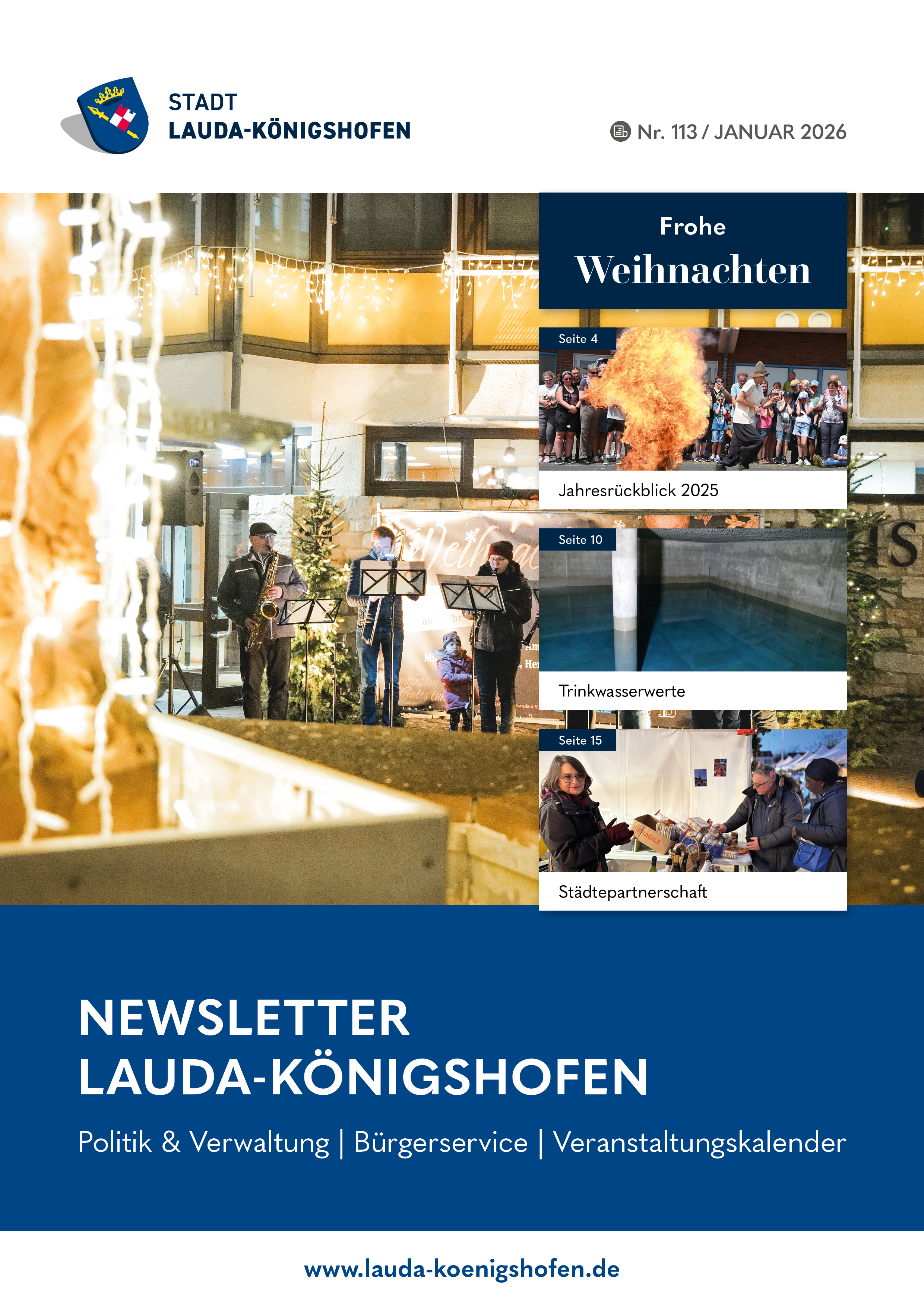 Der offizielle Newsletter der Stadt Lauda-Königshofen informiert jeden Monat über Aktuelles aus den Bereichen Leben & Wohnen, Kultur & Freizeit und Politik & Verwaltung. Dazu gibt es interessante Neuigkeiten aus unseren Stadtteilen sowie den aktuellen Veranstaltungskalender. Dank des lesefreundlichen PDF-Formats lassen sich die einzelnen Seiten übersichtlich am Computer, auf dem Smartphone oder Tablet ansehen. Die Anmeldung ist kostenlos und funktioniert ganz einfach!