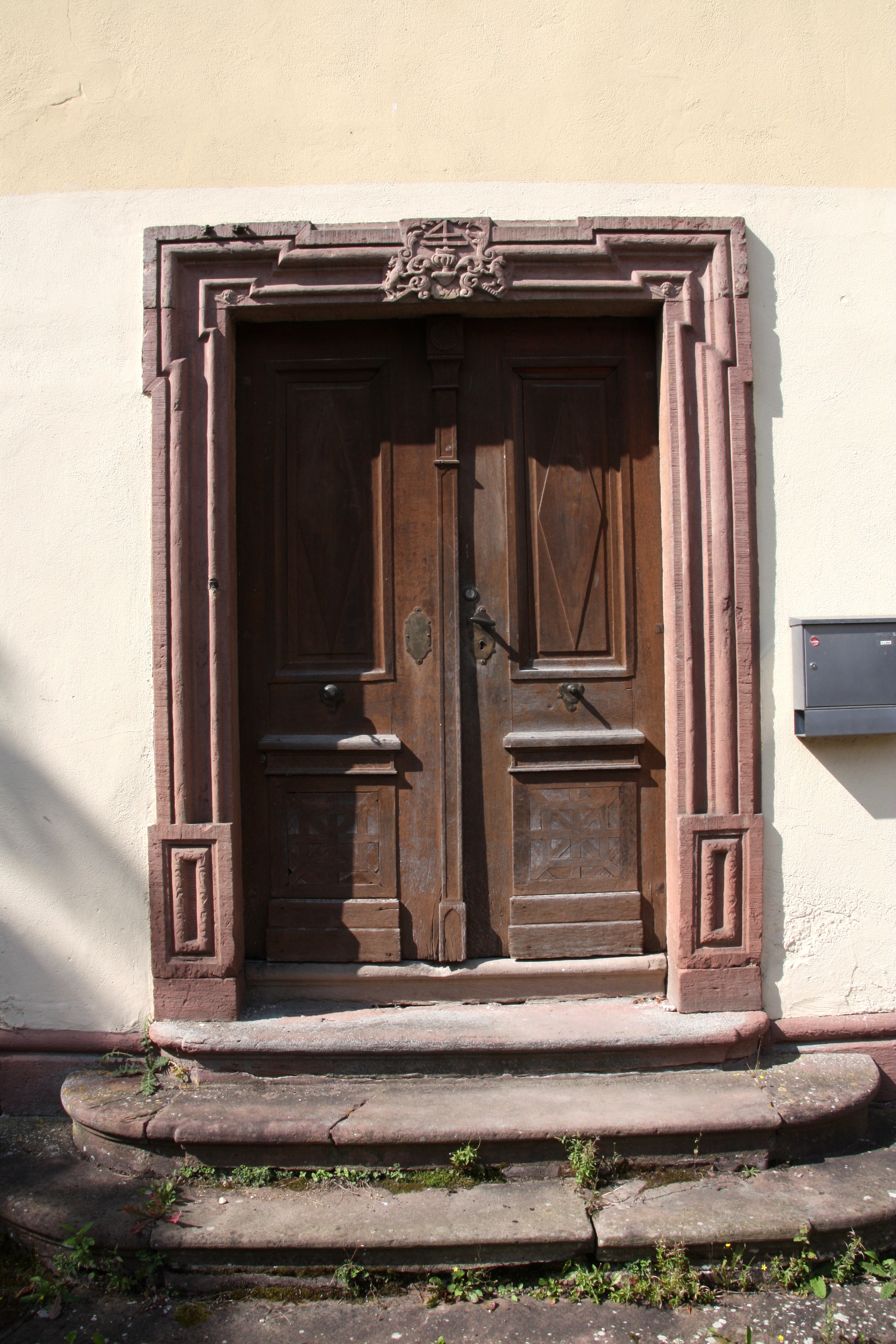 „Stattlicher zweigeschossiger Wohnbau mit Mansardwalmdach über massivem Kellersockel in verputztem Fachwerk ausgeführt und 1758 als Dreiflügelanlage für den vermögenden Weinhändler Johann Simon Abendanz (1715-1796) errichtet (Ökonomieflügel im Osten 1955 abgebrannt und nicht wieder aufgebaut); zur Hofanlage gehört ein Tor im Süden mit vasengeschmückten Pfeilern , die vorgelagerte Zufahrt mit Substruktionsmauer und ein östlich dieser Zufahrt gelegener Keller (Obergeschoss und Dach modern) mit Rundbogentor und eisenbeschlagenen Torflügeln. Das Hauptgebäude zeichnet sich durch reiche Innenausstattung (u.a. Rokokostuckdecken, geschnitzte Treppengeländer) und bemerkenswerten Originalitätsgrad in der Detailerhaltung (Türen, Beschläge, etc.) aus.“