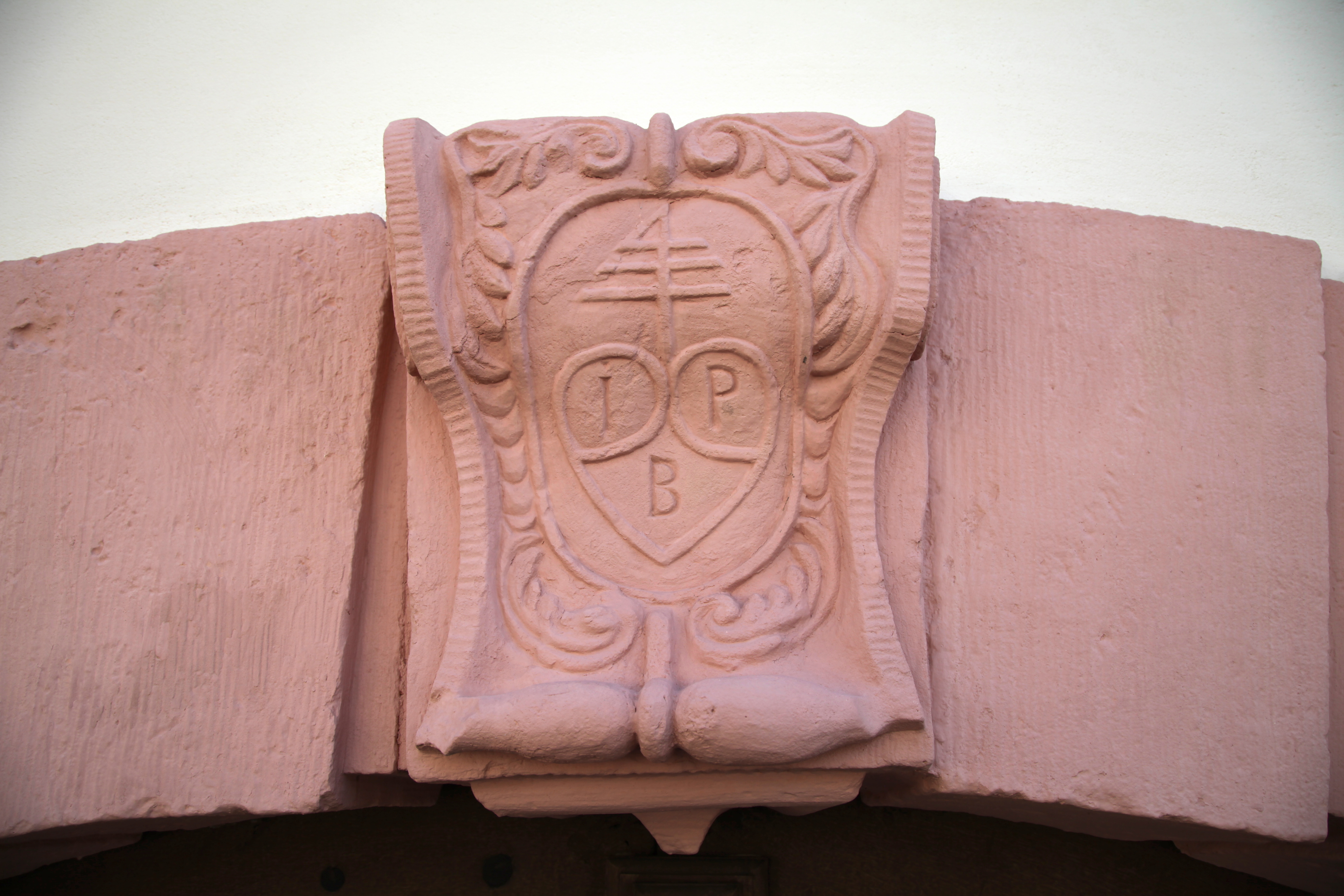 Wappen auf dem Schlussstein über dem Eingangstor zum Buchlerschen Weinhandelshaus