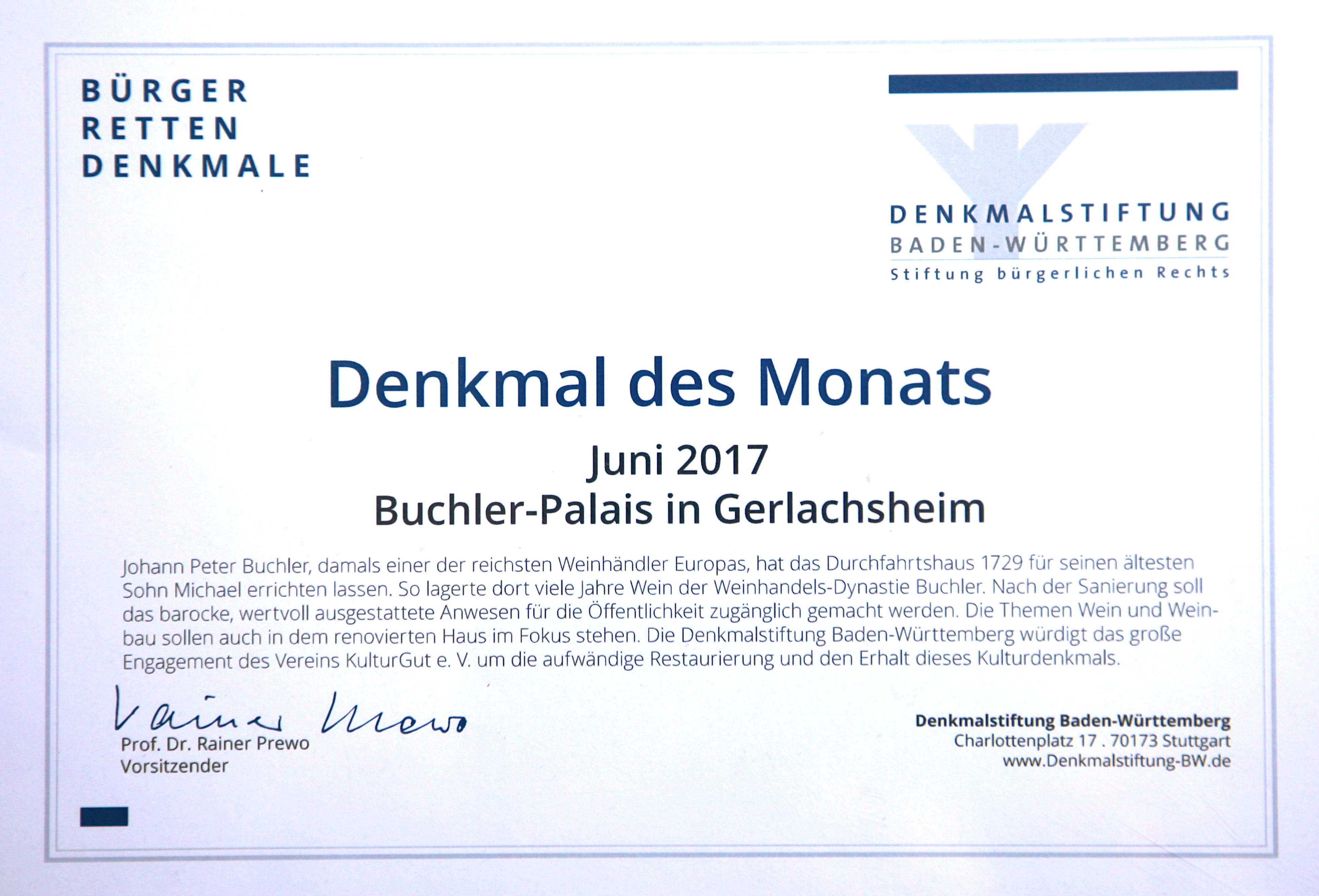 Es ist ein hervorragendes Beispiel für die Bedeutung, die der Weinhandel in unserer Region hatte. Das fast palaisartige Gebäude an der Straße unterstreicht den Rang und die Stellung, die der Weinhändler Buchler hatte. Von größter Bedeutung ist die Tatsache, dass die gesamte Innenraumstruktur mit ihren Stuckdecken erhalten ist und so davon berichtet, wie herrschaftlich der Weinhändler Buchler einst lebte.